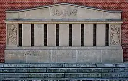 The monument features 7 stone tablets with the names of around 280 perished residents. The majority of the construction was carried out by Thomas Myrtek from Beuthen (now Bytom), with Wilhelm Rose from Gleiwitz (now Gliwice) being commissioned to finish the stone work. Sculptor Ernst Neumeister from Stuttgart designed its bas-reliefs, depicting a woman bearing a child on one side and a man carrying a boulder fighting off a snake on the other.[2][3] An Iron Cross cradled by an olive branch (a symbol of peace) and an oak branch (a symbol of endurance) towers over the memorial's elements. The plinth contains the inscription "Dass Ihr aufständet und sprächet zu uns! Bobrek seinen Gefallenen" (That you may rise and speak to us! Bobrek to its fallen).[2]