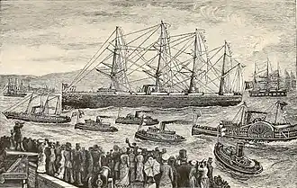 During his stay in Japan, a plot to assassinate Grant and the Emperor by Japanese hardliners was revealed but nothing ever became of the conspiracy.[105] Regardless, Japan, Grant's last visit abroad, proved to be his favorite country on the tour.[106][107] Before departing Consul-General Van Buren delivered a farewell speech for Grant. The Grants boarded the SS City of Tokyo and departed Yokohama Bay bound for San Francisco. As they sailed out of the harbor, various naval escorts fired their guns in salute. A Japanese man-of-war escorted the Grant touring party as far as the Inland Sea, also firing her guns in salute, before the City of Tokyo headed out to open sea. Young later wrote that they felt as though they were saying farewell to friends.[108]