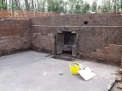 To the west of the terraces, woodland separated the grounds of the New Hall from the gardener's cottage and kitchen gardens. The walled kitchen gardens were laid out in the early 1840s to provide vegetables, fruit and flowers to the residents of the New Hall. The kitchen garden was approximately ten acres in size and its perimeter walls were heated by flues using the Trentham wall case design, in order to create a warmer micro-climate.[10] The kitchen gardens also featured potting sheds, and glasshouses containing cucumber plants, melons, grape vines and peach trees.[1]