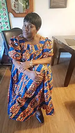 The kaftan is always worn with a headscarf or head tie. During a wedding ceremony, the bride's kaftan is the same color as the groom's dashiki. The traditional color for West African weddings is white.[13] The most popular non-traditional color is purple or lavender, the color of African royalty.[14] Blue, the color of love, is also a common non-traditional color.[15] Most women wear black kaftans to funerals.[16] However, in some parts of Ghana and the United States, some women wear black-and-white prints, or black and red. The kaftan is the most popular attire for women of African descent throughout the African diaspora. African and African-American women wear a wide variety of dresses, and skirt sets made out of formal fabrics as formal wear. However, the kaftan and wrapper are the two traditional choices. It is not uncommon for a woman to wear a white wedding dress when the groom wears African attire. In the United States, African-American women wear the boubou for special occasions. The kaftan or boubou is worn at weddings; funerals; graduations; and Kwanzaa celebrations.