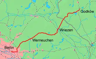 The Wriezen Railway is a line in the northeast of the German states of Berlin and Brandenburg. It runs from Berlin to Werneuchen and formerly extended via Wriezen to Jädickendorf (now Godków in Poland). Its terminus in Berlin from 1903 to 1949 was the Wriezener Bahnhof (Wriezen line station). The predominantly single-track line has operated only between Berlin-Lichtenberg station and Werneuchen since December 2006.