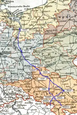 The final stations were originally the today defunct Wrocław Świebodzki railway station German: Breslau-Freiburger Bahnhof) and Szczecin Dworzec Wrocławski (German: Stettin-Breslauer Bahnhof originally under the name of Stettin-Breslau-Freiburger Bahnhof), today part of the Szczecin Port Centralny cargo station.