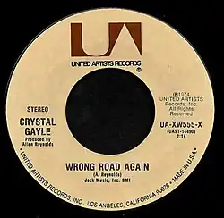 "Wrong Road Again" is a song written by Allen Reynolds, and recorded by American country music artist Crystal Gayle. It was released in September 1974 as the first single from the album Crystal Gayle.