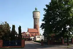 There are three water towers in Września, which once supplied the town with water. Two water towers are still in use. The tallest was built in 1904 (some sources say 1907 and 1911) and is the highest building in the vicinity.[11] The tower is 64 metres (210 ft) tall and its top is finished with a brass dome. The building belongs to the municipal Water Supply and Sewerage Enterprise. Next to the water tower stands the water treatment plant. The tower is near two ponds, allotment gardens and Polytechnic School.
