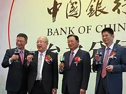 On 27 June 2012, Wu attended the opening ceremony of the first Taiwanese branch of the Bank of China. The ceremony was held in Taipei and Wu was accompanied by Straits Exchange Foundation Chairman Chiang Pin-kung, Bank of China President Li Lihui and the bank's Taiwan branch General Manager Tsai Rong-jun.[10]