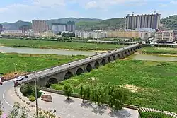The Wuding River (Chinese: 无定河) begins in the Ordos Desert in Shaanxi Province, Inner Mongolia and flows south into loess canyons and farmland. After around 160 kilometres (100 mi) it flows into the great Yellow River. The Wuding has its own tributaries, such as the Dali River, Hailiutu River, Hanjiang River, and the Danjiang River. The course of the river roughly parallels the northern route of the ancient Silk Road, now the National Highway 210.