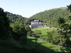 Miller's Dale's main landmarks are the twin railway viaducts, built in 1866 and 1905 to carry four lines. Millers Dale railway station was once a large and busy goods and passenger station. It is now a main visitor centre for the Monsal Trail.[12] Monk's Dale (named after the monastic grange set up there by Lenton Priory) on the north side is a secluded steep valley. The Limestone Way footpath crosses Miller's Dale and runs up and parallel to Monk's Dale. Tideswell Dale is further downstream on the north side. Ravenstor cliff at the foot of Tideswell Dale is popular with rock climbers.[13] Beyond Tideswell Dale is Litton Mill, a cotton spinning mill dating back to 1782 and notorious for its harsh child labour conditions.[14] The Wye Valley is known as Water-cum-Jolly Dale where Cressbrook Dale joins it from the north. Another cotton mill Cressbrook Mill was built in 1815 and dominates the view by the river.[15] The Wye Valley then becomes Upperdale with Hay Dale on the north side before the river reaches Monsal Head.