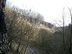 After leaving Ashwood Park (in Mill Dale) in Buxton, the river enters the steep-sided Ashwood Dale. Here Joseph Mallard William Turner sketched Lovers' Leap and its waterfall in about 1831.[5] The story of Lovers' Leap is that an eloping couple managed to leap across the chasm on horseback on their way to get married at Peak Forest church, evading their pursuing parents.[6] The narrow dry gorge of Cunning Dale joins from the north. The short steep Cow Dale and Kidtor Dale are next to each other on the opposite side to Cunning Dale. The remains of Cowdale quarry's 19th-century buildings and lime kilns are high up on the south slope. The site is a Scheduled Monument.[7]