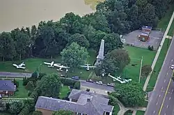An aerial view of the Wyoming Monument, Susquehanna River, and U.S. Route 11. During the flood of 2011, planes from the nearby airport were moved to higher ground.