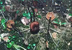 The flesh in the gills is composed of cylindrical hyphae measuring between 4 and 8 μm thick that run parallel to one another. The hyphae typically have fairly thin, smooth walls, but they can have a small amount of brown pigment, which stains orange-brown in potassium hydroxide. The pileipellis, the uppermost layer of hyphae in the cap, forms a cutis made up of cylindrical, slightly thicker-walled hyphae of between 5 and 10 μm wide. They can be interwoven or primarily extending from the margin to the centre. The pigmentation is yellowish-brown and stains reddish-brown in potassium hydroxide. The hyphae below the pileipellis run parallel to one another and measure between 4 and 8 μm in width. Their yellowish-brown pigment stains orange-brown in potassium hydroxide. The stipitipellis, the uppermost layer of hyphae on the stem, also forms a cutis. The cylindrical hyphae run parallel to one another and have thick cell walls. They have a dark red-brown pigment, which stains darker still in potassium hydroxide. Clamp connections are present.[6]