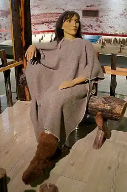 A local hunter named Ördek found the site around 1910. Later, in 1934, with Ördek's help, Swedish explorer and archeologist Folke Bergman located the site which he named Xiaohe, "little river", after a nearby tributary of the Kaidu River.[7] The tomb complex appeared as a small oval mound, and the top of the burial mound was covered with a forest of erect wooden posts whose tops had been splintered by strong winds.[8] Oar-shaped wooden monuments and wooden human figures were found at the site. The coffins were assembled over the bodies which had become mummified. Bergman excavated 12 burials and recovered approximately 200 artifacts that were transported back to Stockholm. Bergman noted the surprising resemblance in the clothing, especially the fringed loin-cloths, to Bronze Age grave finds in Denmark, but dismissed any direct connection.