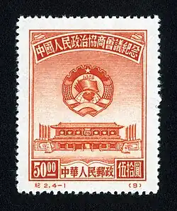 - Commemorative 2 " Chinese People's Political Consultative Conference Commemorative": Issued by the North China Postal Administration on February 1, 1950, designed by Zhang Ding and Zhong Ling. The designs of 4-1 and 4-2 are Xinhua Gate.