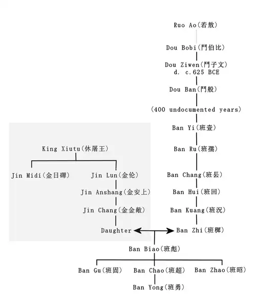 Xiutu was an ancestor of the famous Ban family, and included in his direct descendants through the maternal line the historian of the Hanshu Ban Gu, the diplomat and general Ban Chao and the female historian Ban Zhao.[29] Xiutu had two sons, Jin Midi, who was given the Jin name by Emperor Han Wudi, and Jin Lun. One of Jin Lun's grandson was Jin Chang, an attendant to Emperor Yuan of Han (48–33 BCE), whose daughter married Ban Zhi of the Ban clan. Ban Zhi and his Xiongnu wife's son was the historian and politician Ban Biao, one of their grandsons was historian Ban Gu, and another grandson was General Ban Chao, Ban Zhaowas their granddaughter.[30][29] The Xiongnu origins of Ban Biao on the maternal side might help explain the skills of his illustrious son and grandsons in dealing with matters related to China's history and foreign relations.[29]