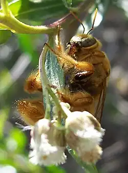Xylocopa sonorina, the valley carpenter bee or Hawaiian carpenter bee,[2] is a species of carpenter bee found from western Texas to northern California,[3] and the eastern Pacific islands.[4] Females are black while males are golden-brown with green eyes.
