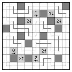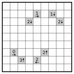 - Every indicative cell is accurate. For example, if an indicative cell has an arrow that points to the left and the number '3', there must be exactly 3 black cells to the left of that indicative cell in the same row.