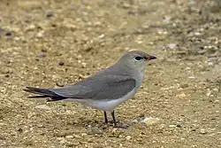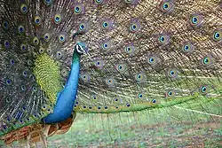 Yala is one of the 70 Important Bird Areas (IBAs) in Sri Lanka.[10] Of 215 bird species of the park, seven are endemic to Sri Lanka.[2] They are Sri Lanka grey hornbill, Sri Lanka junglefowl, Sri Lanka wood pigeon, crimson-fronted barbet, black-capped bulbul, blue-tailed bee-eater and brown-capped babbler. The number of waterbirds inhabiting wetlands of Yala is 90 and half of them are migrants.[3] Waterfowl (lesser whistling duck, garganey), cormorants (little cormorant, Indian cormorant), large waterbirds (grey heron, black-headed ibis, Eurasian spoonbill, Asian openbill, painted stork), medium-sized waders Tringa spp., and small waders Charadrius spp. are among the most common waterbirds. Black-necked stork and lesser adjutant are many of the rare birds that can be seen in the park. The migrant great white pelican and resident spot-billed pelican are also have been recorded. Other waterbirds attracted to the Yala lagoons include lesser flamingo, pelicans, and rare species such as purple heron, night herons, egrets, purple swamphen, and Oriental darter. Thousands of waterfowls migrate to the lagoons of Yala during the northeast monsoon. They are northern pintail, white-winged tern, Eurasian curlew, Eurasian whimbrel, godwits, and ruddy turnstone. The visiting species mingled with residing lesser whistling duck, yellow-wattled lapwing, red-wattled lapwing, and great stone-curlew. Rock pigeon, barred buttonquail, Indian peafowl, black stork, black-winged stilt, and greater flamingo are among the other bird species. Crested serpent eagle and white-bellied sea eagle are the raptors of the park. The forest birds are orange-breasted green pigeon, hornbills, Old World flycatchers, Indian paradise flycatcher, Asian barbets, and orioles.[9]