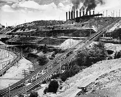 Trains being loaded with overburden in the open cut (1940s)