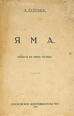 The Pit (Russian: Яма, romanizedYama, published in English as Yama: The Pit) is a novel by Alexander Kuprin published in installments between 1909 and 1915, in Zemlya almanacs (Part 1 in 1909 and Parts 2–3 in 1914–1915). The book, centering on a brothel, owned by a woman named Anna Markovna, caused much controversy in its time.[1][2]
