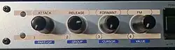 The FS1R uses the "formant sequence",[4] this being a series (128 or 512) of "frames" that define the level and frequency of each of up to eight 'voiced' (pitched) and eight 'unvoiced' (un-pitched) formant generators over time. The number of frames limits the typical length of a sequence to a few seconds, though this length and pitch can be varied in real-time with few or no artefacts. Applying a formant sequence to a sound allows a complex, evolving sound to be programmed in a relatively short time. 90 formant sequences were supplied with the FS1R.