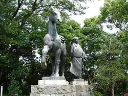 Reproductions of Chiyo's image can be found in a number of places; a bronze statue of her and the horse she gave her husband, which stands near the ascent to Kochi Castle, close a statue of her husband on horseback and full armor; a bronze statue of her, holding the reins of the horse, and her husband, located in the park below Gujo Hachiman castle in Gifu Prefecture; and a portrait of her in retirement, wearing the garb of a Bhikkhuni. There a shrine dedicated to Chiyo and Kazutoyo for strong marriage.