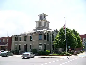 The building features Corinthian order pilasters and polygonal corner projections. It served as the location for county offices until 1965, when a new courthouse was constructed.[2]