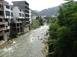 Situated on the banks of the narrow Heng River[1][a] valley, a tributary of the Yangtze, the town of Yanjing, Yanjin's county seat, has been referred to as the "World's Narrowest City."[2][3] The buildings of the city are situated on tall pillars, which is a preemptive measure toward water-level rise during periods of heavy flooding.[4] Videos of the city routinely go viral because of its uniqueness and the surrounding natural environment, attracting much attention to the city.[4]