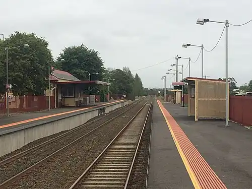 In 1952, the line between Warragul and Yarragon was duplicated.[1] In 1955, electrification of the line was extended from Warragul to Moe, passing through the station.[1] In 1958, duplication of the line to Trafalgar occurred.[1]