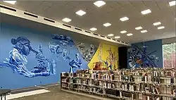 Yatika Starr Fields' 100' x 20' mural in the Pickens Learning Commons includes several different scenes from Northern Oklahoma College including a woman looking through a microscope, show lambs, another woman looking through a stack of books, men in space looking through VR systems, NOC's mascot, Mav the bull, the Roustabouts, and the different performing arts. "These all flow in a beautiful display of colors and an incredible show of knowledge."[17]