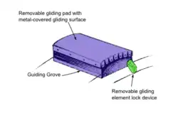 In its simplest form, the gliding yaw bearing uses pads (usually made out of polymers) distributed around the three contact surfaces to provide a proper guiding system for the radial and axial movement with relatively low friction coefficient. Such systems are economical and very robust but do not allow individual adjustment of the axial and radial gliding elements. This function importantly minimizes the axial and radial "play" of the gliding bearing due to manufacturing tolerances as well as due to wear of the gliding pads during operation.