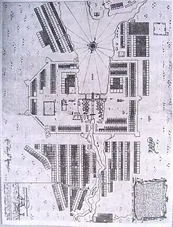 The first Russian settlements within the boundaries of modern Yekaterinburg appeared in the second half of the 17th century — in 1672, an Old Believers village arose in the area of Shartash lake[27] (this fact is disputed by historians, since no evidence of the founding of the village at that time was found in the sources),[28] and in 1680–1682, the villages of Nizhny and Verkhny Uktus appeared on the banks of Uktus River (now the territory of the Chkalovsky district of the city).[29] In 1702, by the initiative of the head of Sibirskiy prikaz Andrew Vinius, the Uktus state ironwork plant was founded near Nizhny Uktus — the first ironworks within the boundaries of modern Yekaterinburg.[30] In 1704, the Shuvakish ironworks was built (now the territory of the Zheleznodorozhny district of the city).[27] With the beginning of active construction of factories in the Urals in the 18th century, relations with their southern neighbors, the Bashkirs, became strained. As a result of the Bashkir raid in 1709, the village of Verkhny Uktus was devastated, all buildings, including the wooden church and chapel, were burned, the residents fled to the protection of the Uktus plant fortifications.[29] On the night of 5 April 1718, a fire destroyed all the factory buildings of the Uktus plant, except for the dam, and the plant was restored only by 1720 under the supervision of Timofey Burtsev.[31] However, the plant did not receive further development due to the lack of water in Uktus river.