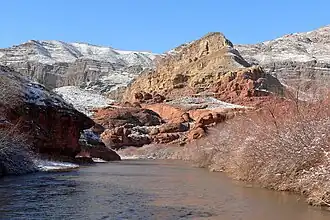 The Yellow Knolls section is bordered on the west by a due-south flowing stretch of Cedar Pockets Wash, which arises on the southeast of Jarvis Peak, 6,530 feet (1,990 m),[2] (the highpoint of the south Beaver Dam Mountains section). The Yellow Knolls section is about 4-mi wide, and Yellow Knolls prominence, 2,668 feet (813 m), is located at the southeast, adjacent the river and gorge, as the river descends from the northeast from Utah.