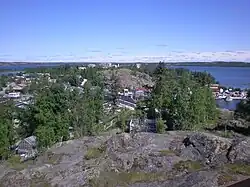 Yellowknife is on the Canadian Shield, which was scoured down to rock during the last ice age.[39] The surrounding landscape is very rocky and slightly rolling, with many small lakes in addition to the larger Great Slave Lake.[40] Trees such as spruce and birch are abundant in the area, as are smaller bushes, but there are also many areas of relatively bare rock with lichen.[41] Yellowknife's high latitude causes a large variation between day and night. Daylight hours range from five hours of daylight in December to 20 hours in June. Civil Twilight lasts all night from late May to mid-July.[42]