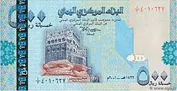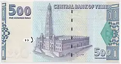 At the time of unification, the Central Bank of Yemen issued banknotes in denominations of 1, 5, 10, 20, 50, and 100 rials. In 1993, the 1 and 5 rial notes were replaced by coins, with the same happening to the 10 rial notes in 1995, and 20 rial notes in 2004. In 1996, 200 rial notes were introduced, followed by 500 rials in 1997 and 1,000 rials in 1998. A 250 rial banknote was issued in 2009.[8][9]