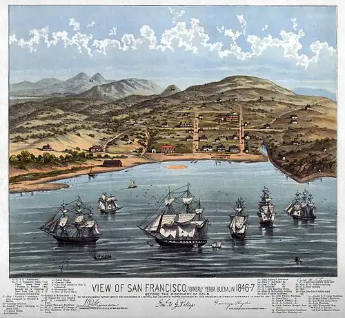 - View of San Francisco, formerly Yerba Buena, in 1846-7 before the discovery of gold — A panoramic map of Yerba Buena Cove and early San Francisco; American Memory Map Collections, Library of Congress.