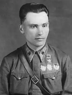 Yevgeny Petrovich Fyodorov (Russian: Евгений Петрович Фёдоров; 28 December [O.S. 15 December] 1911 – 15 July 1993) was a Soviet Air Force major general and double Hero of the Soviet Union. From 1933 Fyodorov served as a pilot in a Long Range Aviation regiment. He was a squadron commander during the Winter War and was awarded the title Hero of the Soviet Union for conducting bombing sorties. Fyodorov served with Long Range Aviation during World War II and was awarded the title Hero of the Soviet Union a second time for making strategic bombing sorties in June 1945. Fyodorov retired as a major general in 1958 and lived in Leningrad, where he worked at the airport.[1]