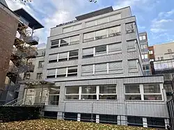The international character of this modernist firm was created by Rosenberg, born in Slovakia and who practised architecture in Prague before the Second World War, and Mardall, born in Finland, as well as by the number of staff from all parts of the world.[2] Their most notable trademark was the use of white ceramic tiles for the treatment of external façades inspired by Le Corbusier's use of tiles on the entrance drum of the Armée de Salut (1929) in Paris and the General Pensions Institute (1929–34) in Prague designed by Josef Havlíček and Karel Honzík and worked on by Rosenberg.[3][4] Their main field of work was hospitals, schools, colleges, offices and industrial buildings[5] as well as Gatwick airport.[6]