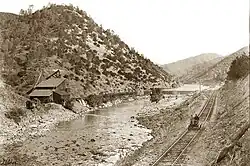 The entire roadbed for the Yosemite Valley Railroad was blasted out of solid rock, which required approximately 3,000,000 pounds of dynamite and powder and 285 miles of fuse. Three Howe truss bridges were built to cross the canyon's steep walls, located at Hopeton, Pleasant Valley, and Bagby, with a total of 65 smaller bridges and trestles along the route. The completed route had 63.5 miles of grades and 32.9 miles of curves with a maximum grade of 1-2%.[13] The main line had Bessemer rail weighing 70 pounds to the yard, and there were 505 curves, as well as 10,265 miles of yards and sidings.[3]: 15–16 A telephone and telegraph line was constructed along the route and completed on July 1, 1907, connecting Yosemite with the outside world.[14]