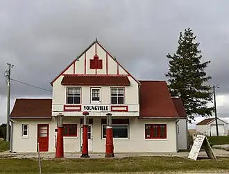 Youngville Cafe, also known as Youngville Station, is a historic building located northwest of Watkins, Iowa, United States. It was a one-stop roadside business that included a café, a Skelly gas station, and three cabins for travelers to stay in. The cabins have subsequently been removed. The building calls attention to increasing business opportunities for women.[2] The Tudor Revival building was built in 1931 by Joe Young on his pasture land for his widowed daughter Lizzie Wheeler to support her and her children. The main building also contained residential space where the family lived. It is located on U.S. Route 30, which at this point had been the Lincoln Highway. The café/station also served as a bus depot for the Greyhound and Jefferson bus lines.