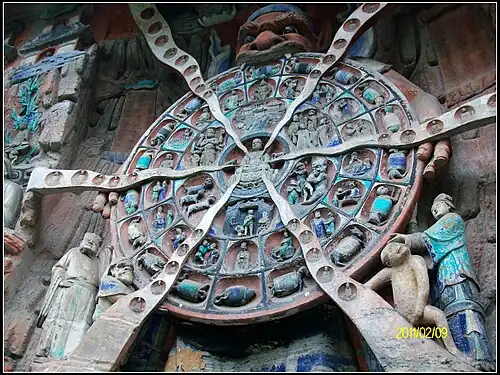 A Bhavacakra depicting the six realms of sentient beings in saṃsāra at the Dazu Rock Carvings in Chongqing, China.