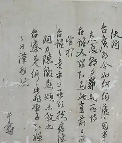 In March 1591, a letter sent by Toyotomi Hideyoshi through Joseon Tongsinsa said he would invade Ming dynasty, but unlike other subjects who insisted on hiding it from the Ming dynasty, he actively insisted on telling the Ming Dynasty the situation of Japan.[2] In October 1591, when he was exiled to Hongwon, diplomatic envoys to Ming (진주사) returned from Beijing. When they reported that the Wanli Emperor praised the situation of Japan in detail, the royal court tried to let him go of his exile for his contribution, but he was transferred to Haeju due to opposition from the Office of Censors and the Office of the Inspector General. On April 13, 1592, when Japan captured Dongnae following Busan, he was released on 23 April as king's special order.[32]