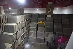 The exact year Yunju Temple was built is unknown; however construction started during the Northern Qi dynasty (550 CE – 570 CE).[1][note 1] Around 611 CE, a high priest named Jingwan (? - 639 CE) made a vow to engrave Buddhist sutras on stone steles to insure Buddhism's future survival because of the challenges Chinese Buddhism had recently faced during the anti-Buddhist campaigns of Emperor Taiwu of Northern Wei and Emperor Wu of Northern Zhou.[2]: 114 [note 2] Venerable Jingwan therefore set in motion a movement to engrave Buddhist sutras on stone steles that continued for over a thousand years; the last stone sutra stele engraved is dated to 1691 CE --- although by that time, the belief in the impending disaster of the Degenerate Age had subsided.[3][note 3][1][note 4] The stone sutra steles varied in size and were engraved on both sides. In addition to text, they were also engraved sometimes with images of Buddhas and Bodhisattvas as well as Siddhaṃ Letters. The collection of stone sutra steles is also sometimes called the Fangshan Stone Sutra (Chinese: 房山石經). Venerable Jingwan initially vowed to engrave the entire Tripitaka; at least ten titles still survive today.[3][note 5][4] His successors continued his work. One of them was involved in the engraving of the oldest extant copy (dated to 661 CE) of Tripitaka Master Xuanzang’s 649 CE translation of the Heart Sutra.[5] During the Sui and Tang dynasties, donors oftentimes determined which sutra to engrave on the stone stele; hence many sutras were engraved multiple times. Royal patronage began in the Sui dynasty (see below for rediscovery of Buddha relics). During the Tang dynasty, Princess Jinxian (ca. 713 - 755 CE) petitioned Emperor Xuanzong to donate over 4,000 manuscript scrolls of the Buddhist Tripitaka and land to support Yunju Temple's engraving of stone sutra steles.[3][note 6] There is still a pagoda commemorating Princess Jinxian's support on the top of Fangshan mountain.[2]: 115 [note 7] During the Liao dynasty, royal patronage attempted to complete the engraving of the incomplete Mahayana sutras and missing Mahayana titles. Also during this time, royal patronage attempted to engrave on stone stele the entire Liao dynasty's Khitan Tripitaka (Chinese: 契丹藏). Because the Sui and Tang dynasty manuscripts on which the Sui and Tang dynasty stone steles were based as well as the printed copies of the Khitan Tripitaka on which the Liao dynasty stone sutras were based have largely disappeared, this makes the Fangshan stone sutras of Yunju Temple a rare treasure house of Buddhist sutras.[6] Since these stone steles were engraved with an eye on fidelity to the original, they can be used to potentially correct later printed Tripitakas. Since Venerable Jingwan's time a total of nine caves were excavated and filled with stone sutra steles, two underground depository rooms were also excavated and numerous temple halls were added and repaired. The most famous cave is Cave No. 5 popularly known as Leiyin Cave (Chinese: 雷音洞). This cave is opened for public viewing and is a large cave covered with stone sutra steles on four walls with an area for Buddhist ceremonies. Formerly a statue of Maitreya, the next Buddha was enshrined here but it was removed by unknown persons during the early 1940s.[7] In the early 1940s, a significant portion of the temple was destroyed; however substantial portions have since been restored.[8][2]: 124 [note 8] Based on inscriptions on a stone stele found in a refreshment/rest stop pavilion donated by a Ming dynasty Buddhist stating the presence of Buddha relics or śarīra in Leiyin Cave, on November 27, 1981, archaeologists rediscovered the flesh śarīra (of Buddha) donated by Emperor Yangdi of the Sui dynasty dated to the 8th day of the 4th lunar month 616 CE.[9][10]