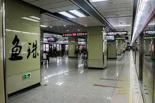 Yuzhu Station (Chinese: 鱼珠站), formerly Maogang Station (茅岗站) during planning,[1][2] is an interchange station between Line 5 and Line 13 of the Guangzhou Metro, and also serves as Line 13's western terminus.[3] It is located under Yumao Road (鱼茅路) near the south of the Maogang Interchange (茅岗立交) on Huangpu Avenue (黄埔大道) in the Huangpu District.[4] It opened on 28 December 2009.[5]