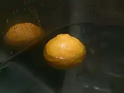 A yuzu bath, also known as a yuzuyu (柚子湯), is a bathing tradition that is celebrated on the winter solstice in Japan. Yuzu fruits, citrus fruit of East Asian origin known for their characteristically strong aroma and the fragrant oil from their skin (nomilin), are floated in the hot water of the bath, releasing their aroma. The fruit may also be floated cut in half, allowing the citrus juice to mingle with the bathwater and color it yellow-orange, or enclosed in a cloth bag. Alternatively, yuzu-scented bath salts are used.[1] Yuzu baths are believed to guard against colds, treat the roughness of skin, warm the body, and relax the mind.[2][3]