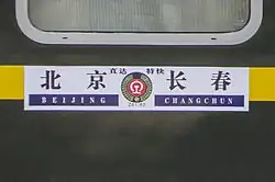 The Z61/62 Beijing–Changchun through train (Chinese: Z61/62次北京到长春直达特快列车) is a Chinese passenger train running between the capital Beijing and Changchun, the capital of Jilin, operated by the Shenyang Railway Bureau.[1] Changchun passenger segment is responsible for passenger transportation, Changchun originating on the Beijing train. 25T type passenger trains are used along the Jingha Railway across Jilin, Liaoning, Hebei, Tianjin, Beijing and other provinces and cities, for the entire 1,002 km (623 mi). Travel time from Beijing railway station to Changchun railway station is 8 hours and 28 minutes on train number Z61, while travel time from Changchun to Beijing is 8 hours and 11 minutes on its counterpart, train number Z62.
