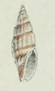(Original description) The shell is fusiformly ovate and subpellucid. It is white, with a thin indistinct brown line interrupted by the ribs around the lower part of the whorls, and a transparent pellucid zone at the top, with a second band or series of short flames just below the middle of the body whorl, which is stained with brown at the extremity.