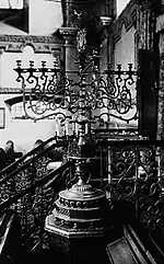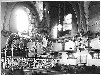 The vaults of the synagogue, both in the main hall and in the porches, are richly decorated with stucco in the so-called "Kalish-Lublin" style. Floral motifs including a stylized Tree of Life, crowns, and rosettes are also to be found. The walls used to bear very rich paintings and numerous Hebrew inscriptions. One of the only features remaining that indicates its former use as a Jewish house of prayer is the Aron Kodesh on the Eastern wall which dates from the first half of the 17th century. The lavishly decorated stone carved frame depicts motifs of ritual vessels used at the Temple in Jerusalem and a Torah crown. The octagonal iron bimah was located at the center of the prayer hall and was a gift by Shmuel Barzel in 1787. The prayer hall also boasted a number of majestic candelabras. Today nothing remains either of the bimah or of the candelabra.