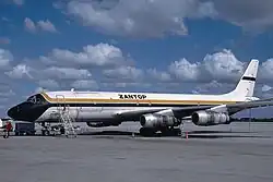 On 30 May 1972, the same three Zantop brothers, along with two other people, incorporated Zantop International Airlines, Inc. (ZIA).[1] ZIA was a Part 121 commercial operator, an airline that held Federal Aviation Administration (FAA) operational certification, but no economic certification from the CAB because it was not a common carrier; it did not accept shipments from the public. ZIA performed its first commercial operations in June 1972.[2] In 1977, as a result of legislation that required all airlines flying for the military to be certificated, ZIA applied for and received CAB certification as a supplemental air carrier.[3] ZIA was then a contractor for the United States Air Force Logair program for the next 14 years, from 1977 to 1991 when it was underbid and lost the contract[4] (the Logair program ended completely in 1992).[5]