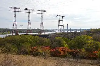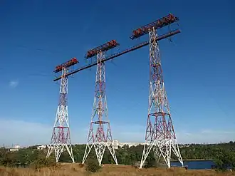 The Zaporizhzhia Pylon Triple is a set of two triples of 74.5 metres (244 ft) tall electricity pylons extending over the Dnieper river standing on a 27m rock in Zaporizhzhia, Ukraine. They are used for the transport of electricity generated at the Dnieper Hydroelectric Station over a span of 900 metres from Khortytsia island to the east bank of the Dnieper. The two triples are an unofficial landmark of Zaporizhzhia.
