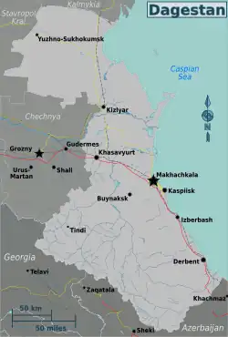The Northern Caucasus region of Dagestan contains dozens of ethnic groups and languages.[22] It has been dogged by conflicts between the Islamic Sufis, who recognise the state, and Salafis, who reject secular rule.[22] This conflict has led Dagestan to the highest levels of violence in the North Caucasus republics.[23][24] The Russian Interior Ministry stated that of the 399 terrorist crimes in the North Caucasus in 2013, 242 were in Dagestan.[25]