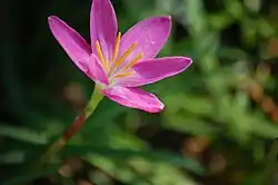 Zephyranthes minuta is a bulb-forming perennial with shiny green leaves up to 7 mm wide. Flowers in wild specimens are usually pink, funnel-shaped, up to 9 cm long. Cultivated specimens are frequently larger, often with extra tepals.[2][6]